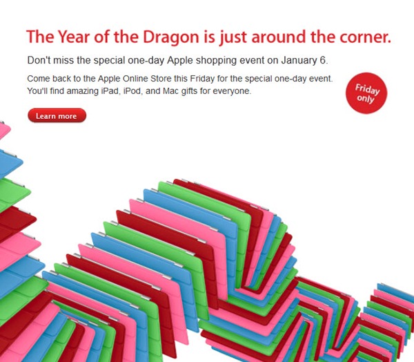 ปีที่เเล้วที่ต่างประเทศมีงาน Black Friday ซึ่งมักจะจัดในช่วงเทศกาลคริสมาสต์ของทางฝั่งยุโรปหรือสหรัฐซึ่งทาง Apple Store Thailand ก็ไม่ได้มีโปรโมชันอะไรที่กี่ยวกับ Black Friday เพราะเเถวเอเซียไม่ได้มีเทศกาลเเบบนี้ เเต่ล่าสุดที่เว็บไซต์ Apple Store Thailand ก็ได้ประกาศลดราคาสินค้าในวันที่ 6 มกราคม 2555 โดยเรียกกันว่า Red Friday (คาดว่าน่าจะเป็นเทศกาลตรุษจีนนั่นเอง)
